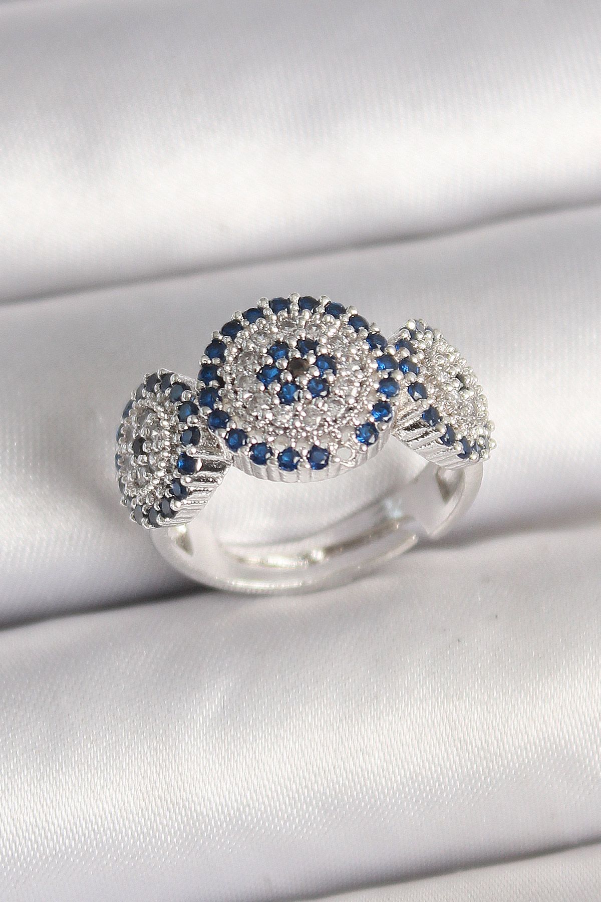 Pirinç Gümüş Renk Zirkon Taşlı Nazar Boncuk Model Ayarlanabilir Kadın Yüzük - TJ-BYK3699